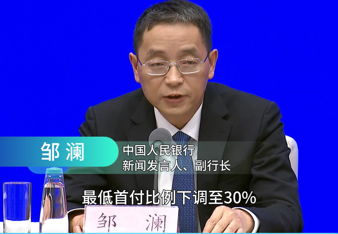 中国人民银行新闻发言人、副行长邹澜在国新办发布会上表示,人民银行会同金融监管总局将商业用房购房贷款最低首付比例下调至30%,支持推动商办房地产市场去库存。