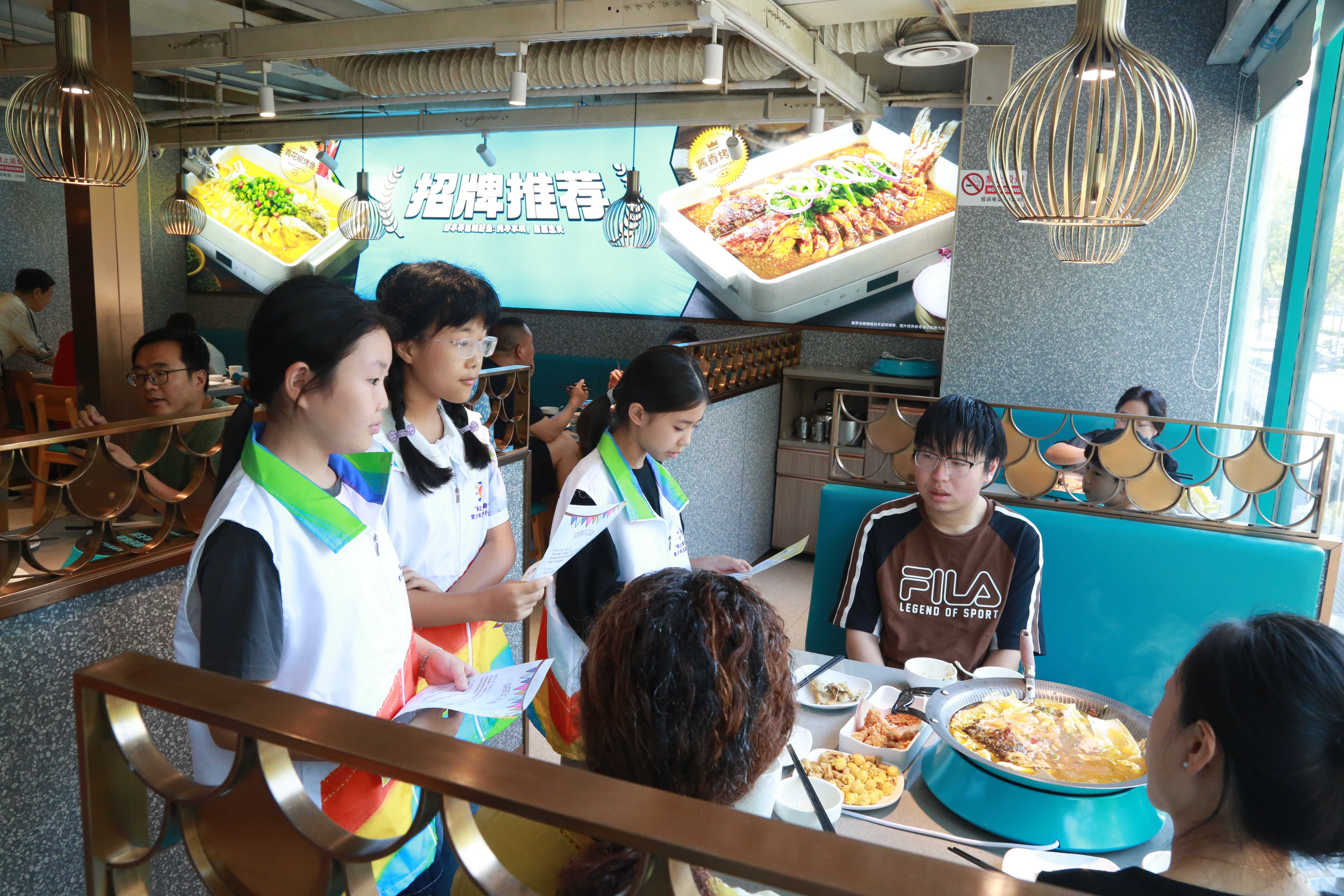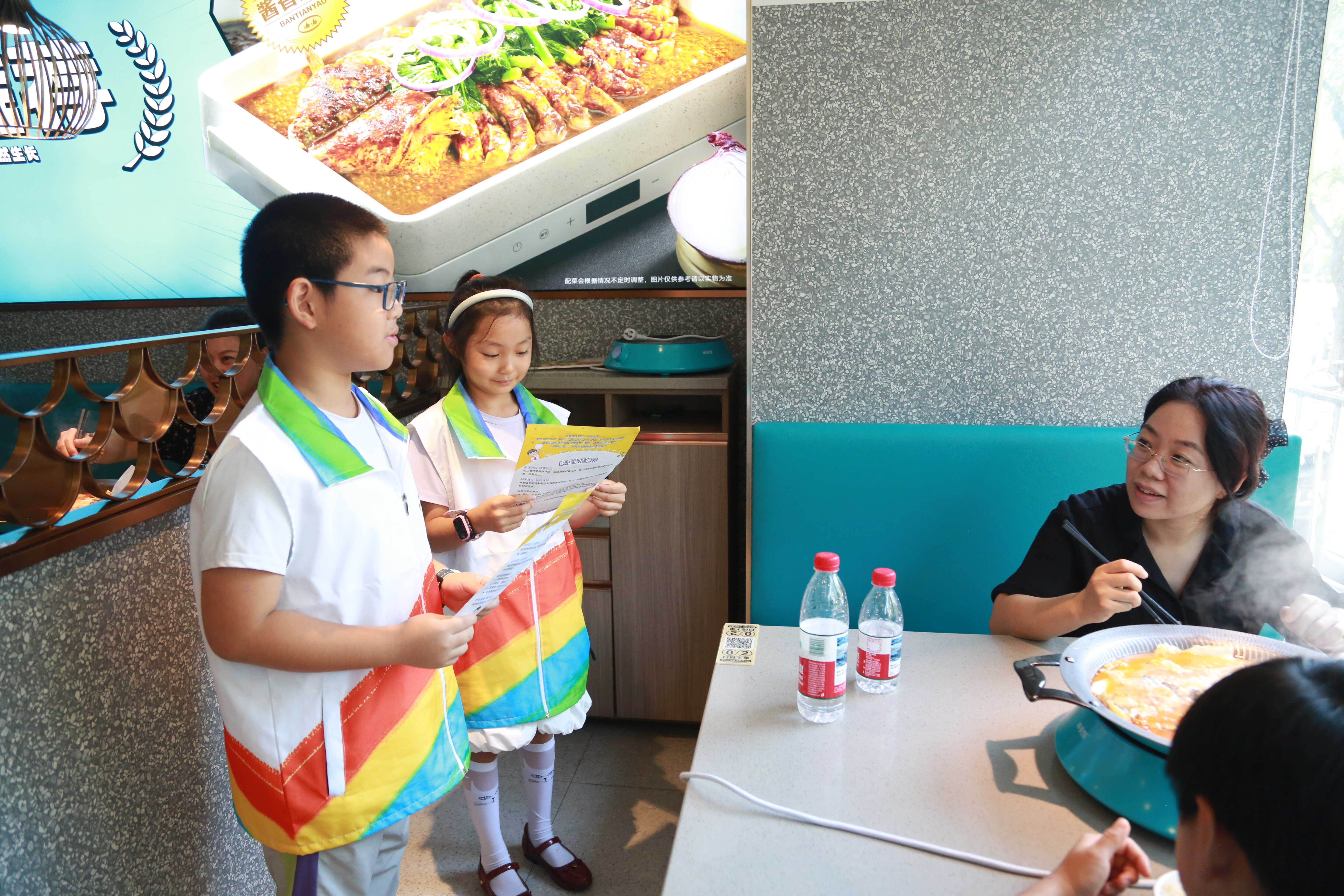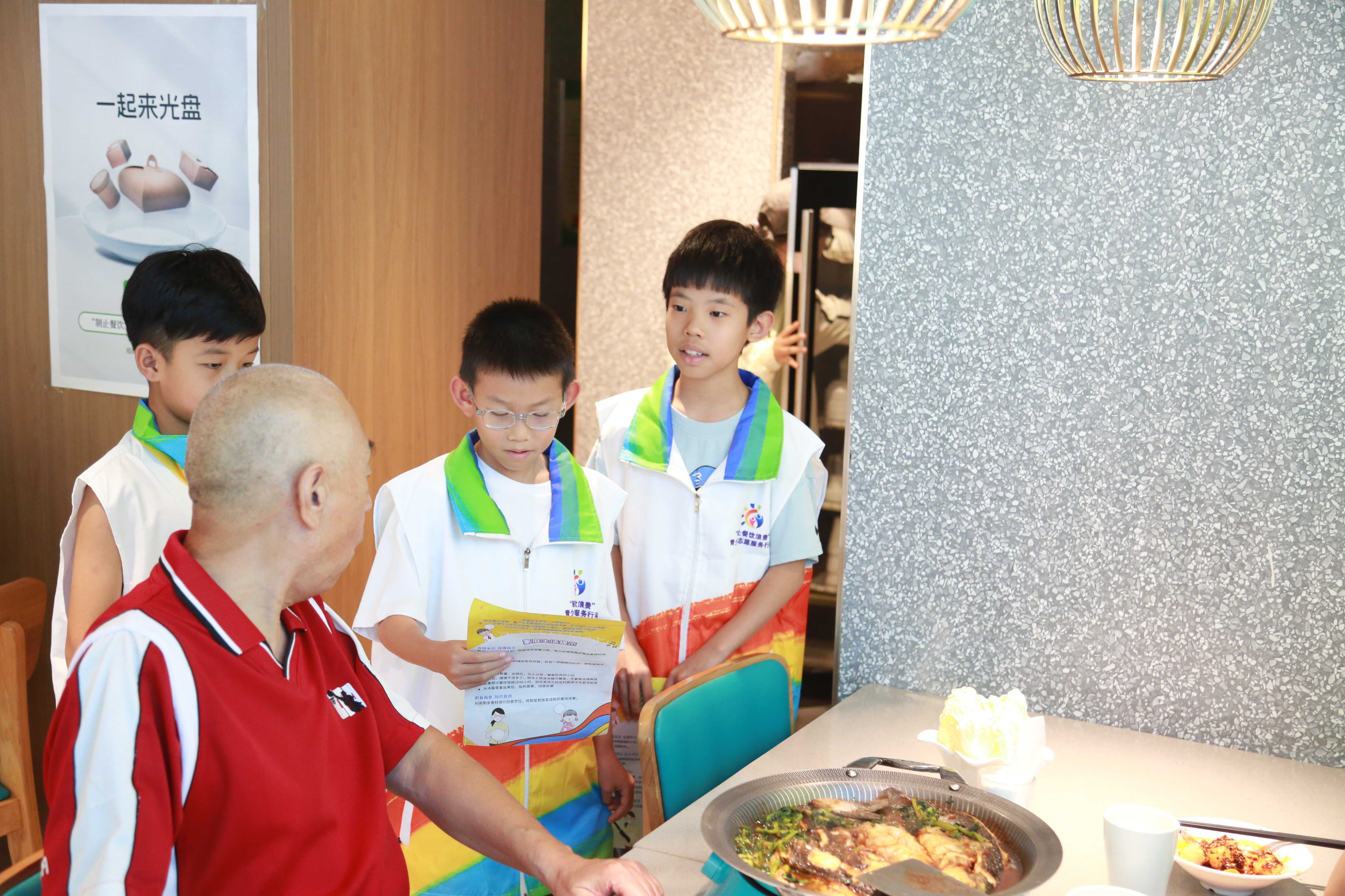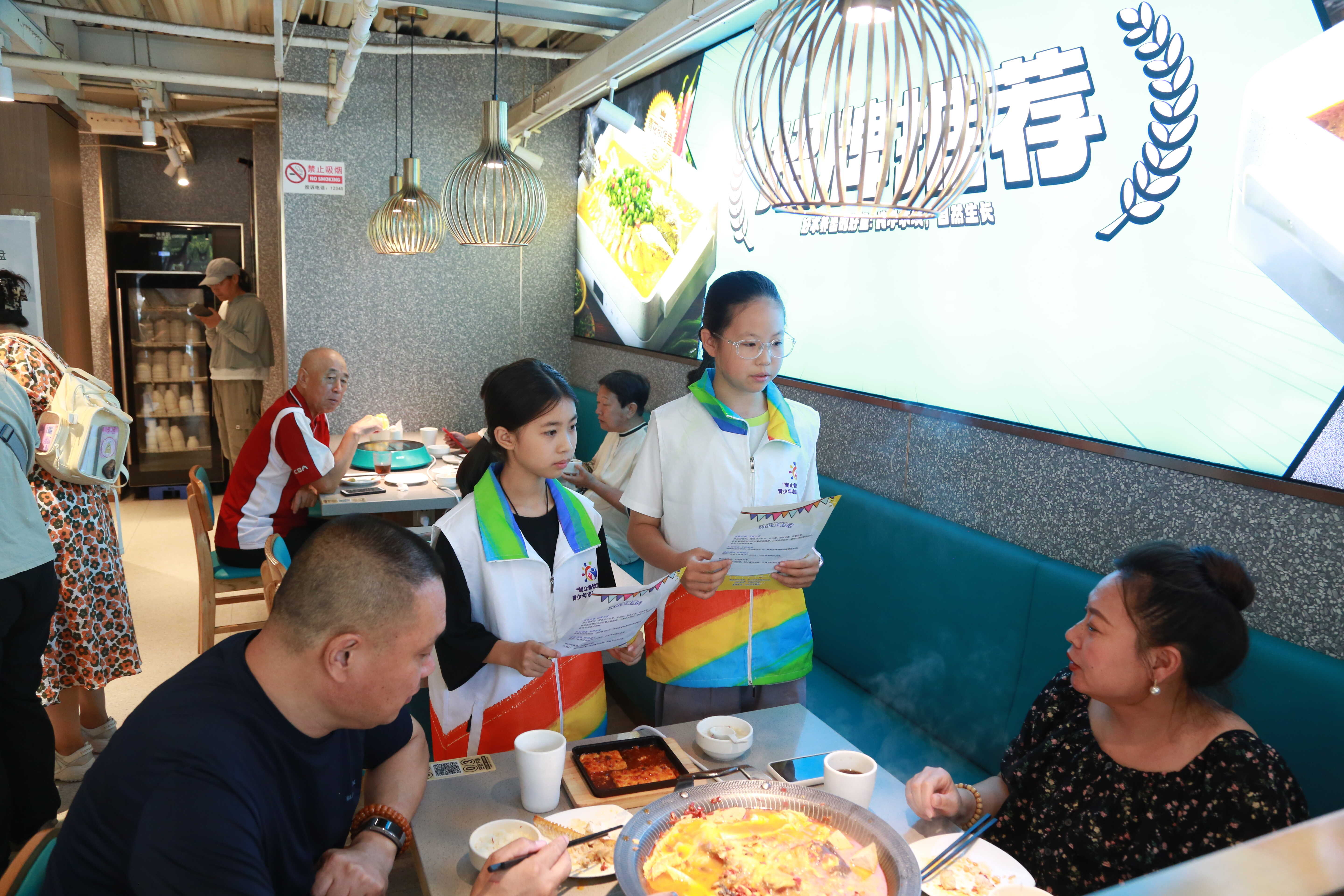 志愿者给顾客介绍节约粮食的重要性